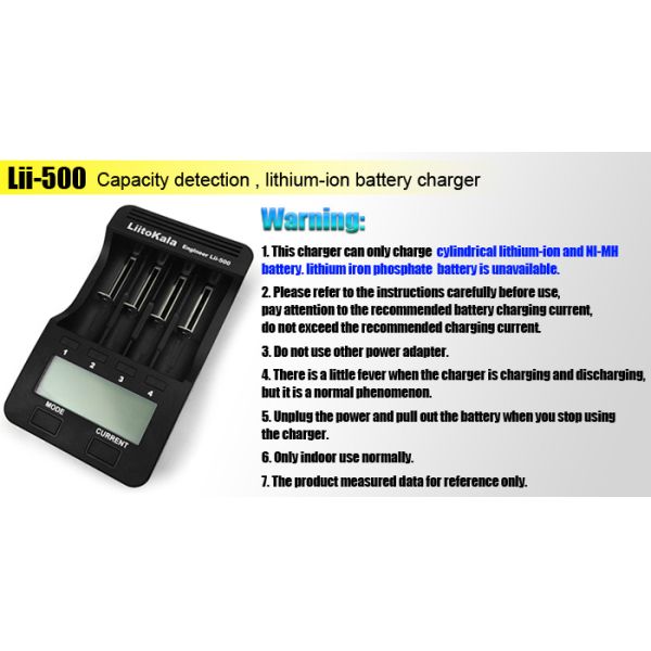 General | Brand: LiitoKala Type: Charger Model: Lii-500 Plug: US adapter Charging Cell Type: NiCd,Ni-MH,Lithium Ion Compatible: A,AA,AAA,18650,26650,14500,16340,17670,10440,18490,22650,17500,SC,26500,17355 Rechargeable Battery Qty: 4 Input Voltage: DC 12V Output Voltage: DC 5V / 1A (max.) |